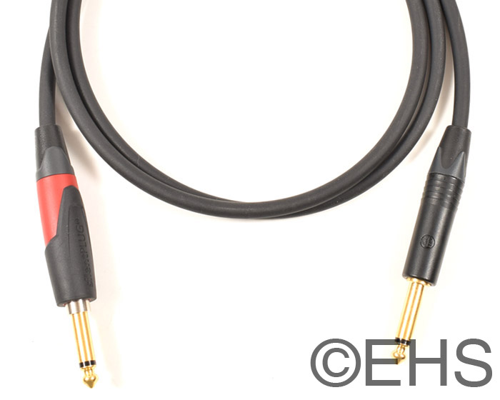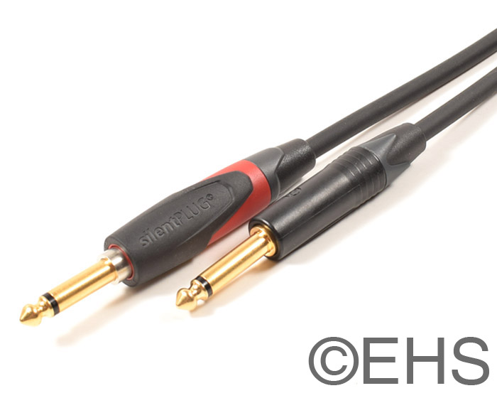 This is our custom-built Gold "Silent" TS to Gold TS Concert1 Unbalanced Line Cable or Guitar and Instrument cable (TS is 1/4" mono or unbalanced connector). The Gold TS Silent is a special version of a TS plug with integrated switch which automatically mutes (shorts) a guitar cable to avoid annoying pops and squeals when hot swapping guitars. Construction is Neutrik gold TS connectors with RapcoHorizon Concert1 cable. Neutrik connectors are some of the best connectors around. RapcoHorizon Concert1 cable is very flexible, durable, heavy-weight cable. If you are on more of a budget, you might consider the INST1 cables.