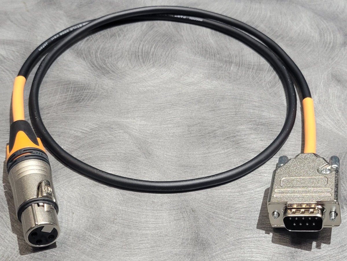 We are always up for a special request! This one is for a DB9 male to single female XLR. This is for an Apogee Mini-DAC. It uses the DB9 for two AES inputs, but the customer only needs one. This is made with Mogami W3080 and includes orange shrink and boot.